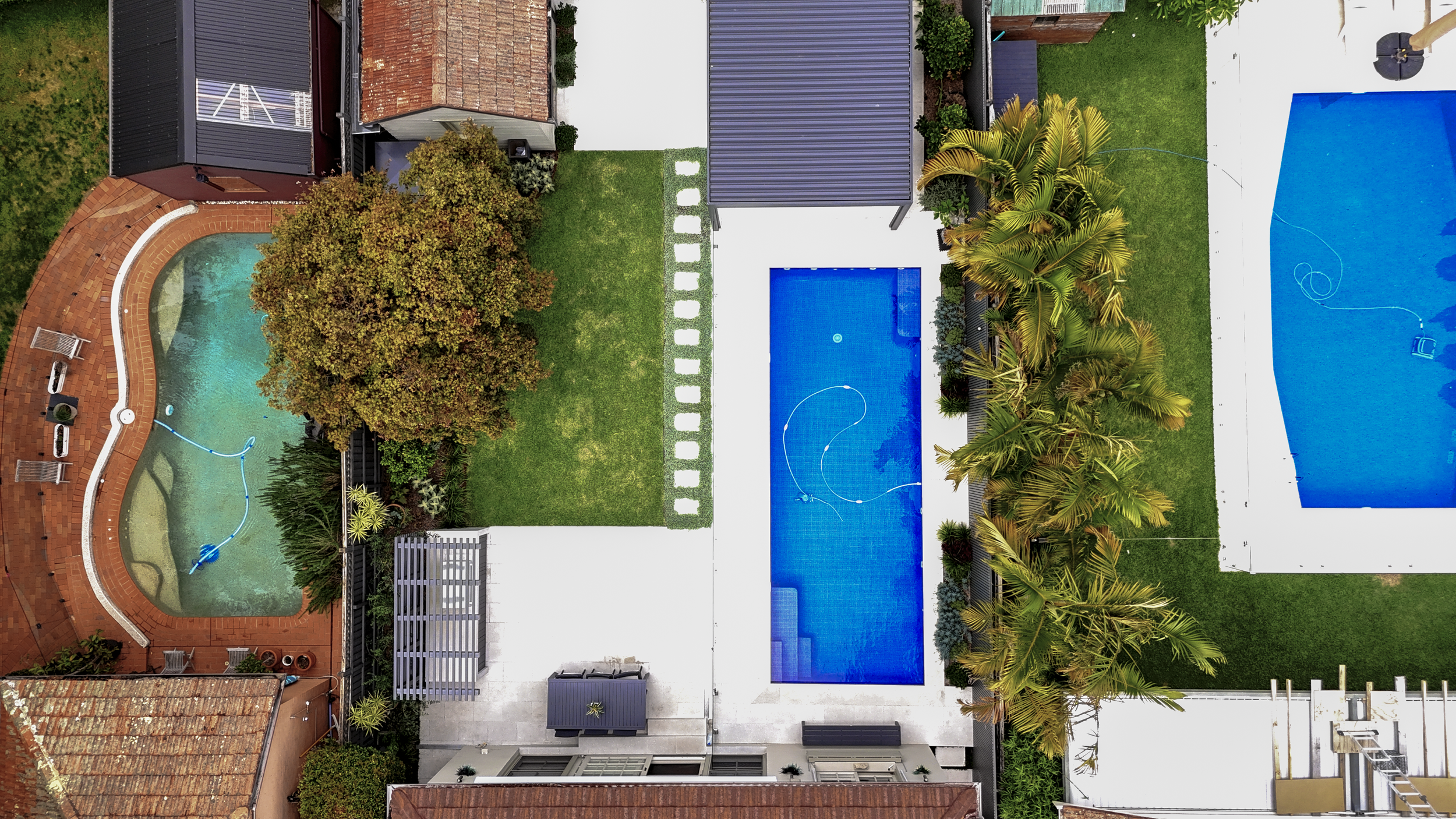 Aerial photography for repeat client Prospect Landscapes at 87 Fourth Avenue, Willoughby, capturing the finished outdoor space in its entirety. The drone shots highlight the new BBQ area, pool, gazebo lounge and fresh lawn — giving a clear view of the layout, detail and overall transformation, and providing strong visual content for marketing and future project showcases.