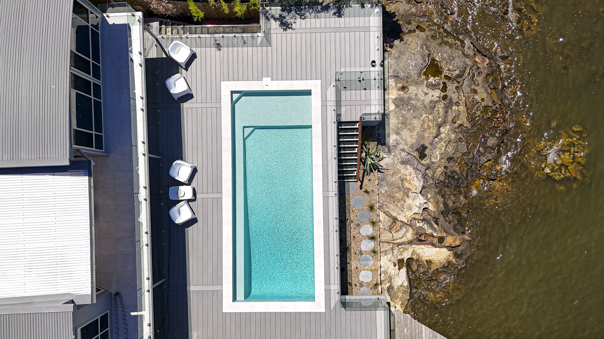 Nestled along the waterfront in Mooney Mooney on the Central Coast, this property by Flawless Gardens is a masterclass in outdoor living. We were called in to document the completed transformation from above — covering the newly installed pool, beautifully crafted decking, a landscaped lower pool garden area, and lush new planting across the grounds. From the air, you can truly appreciate the scale of the work and how seamlessly it all flows down to the water's edge. A stunning project, perfectly captured.