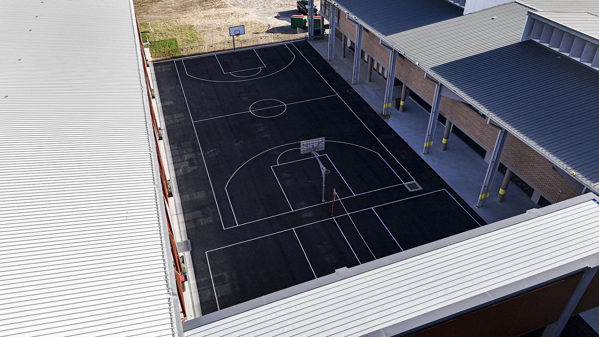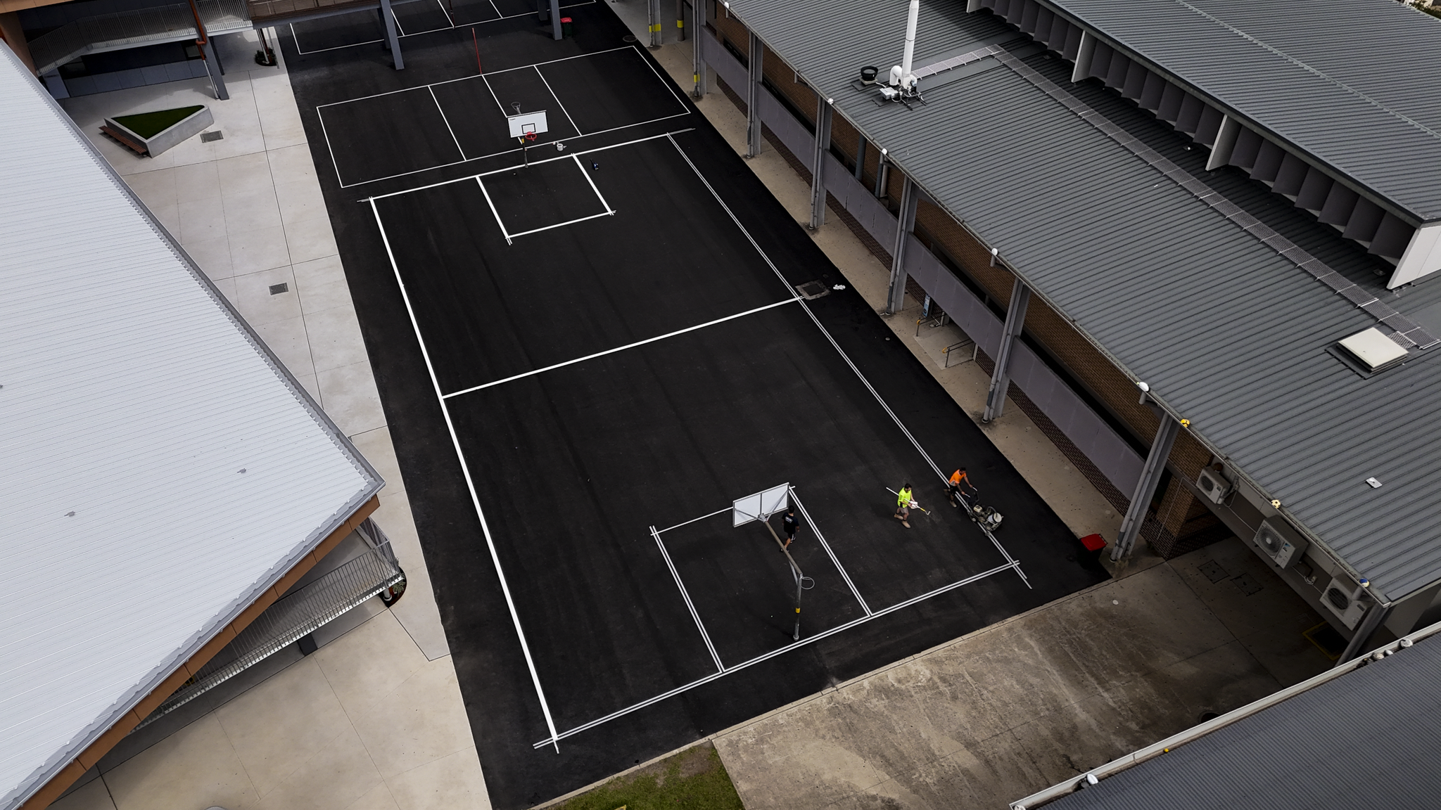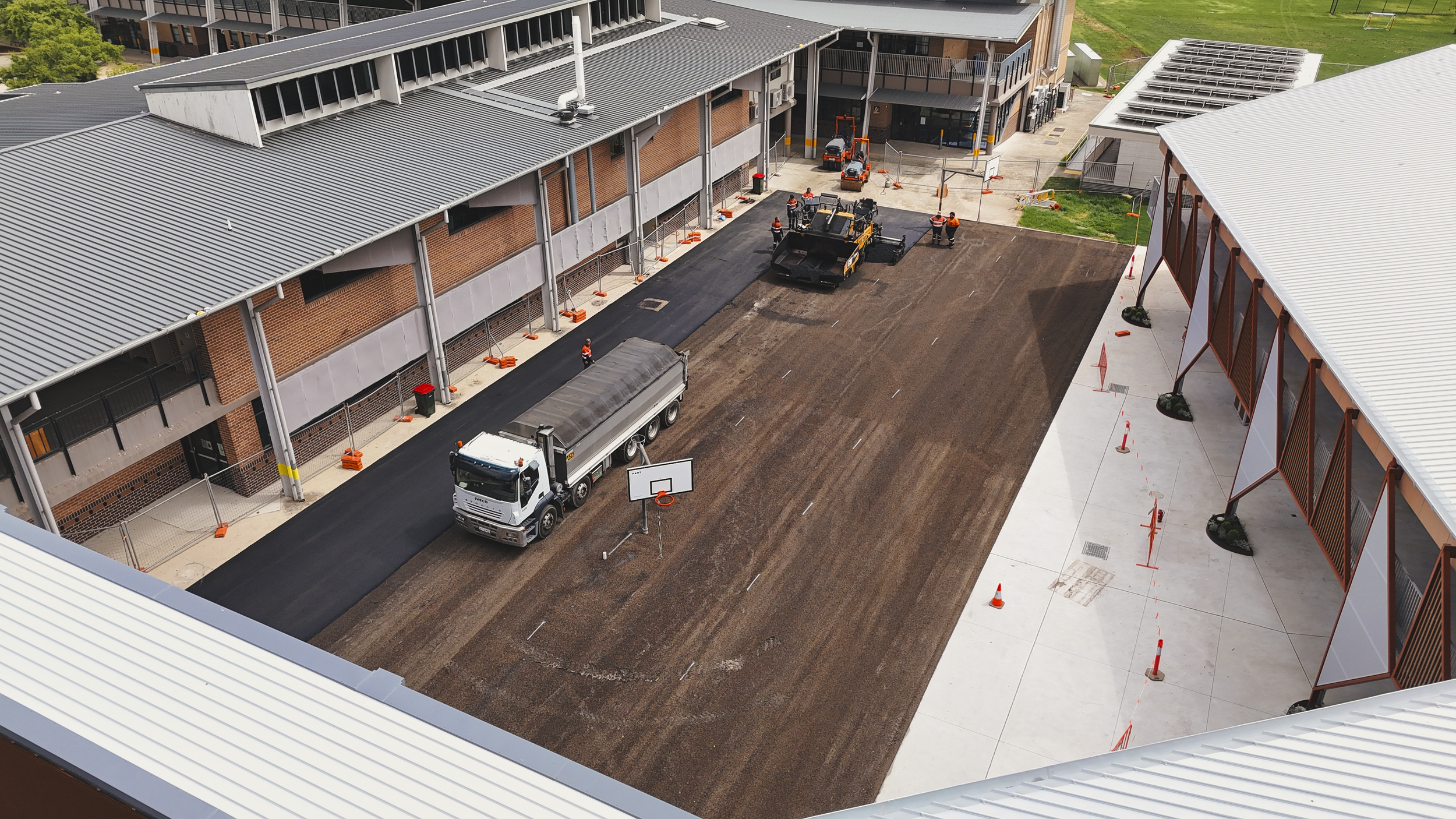 Covered for Prospect Landscapes across a multi-day project at St Johns XXII high school, capturing the complete transformation of a full-sized basketball court from bare ground to finished surface. The scope included aerial documentation of the asphalt lay, curing stages, and professional line marking — providing Prospect Landscapes with a comprehensive visual record of the build from start to finish.