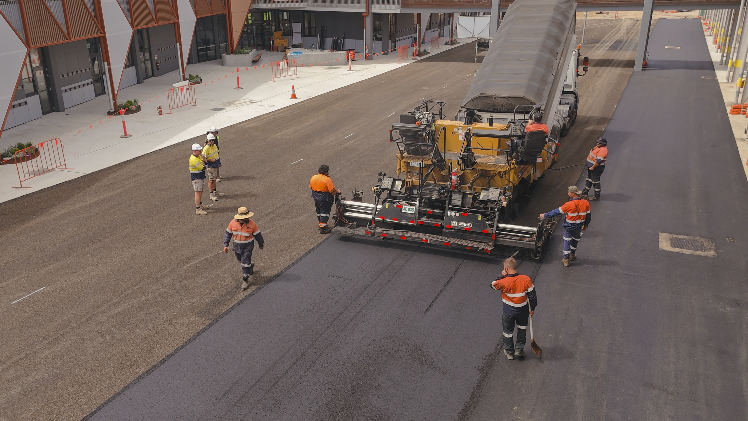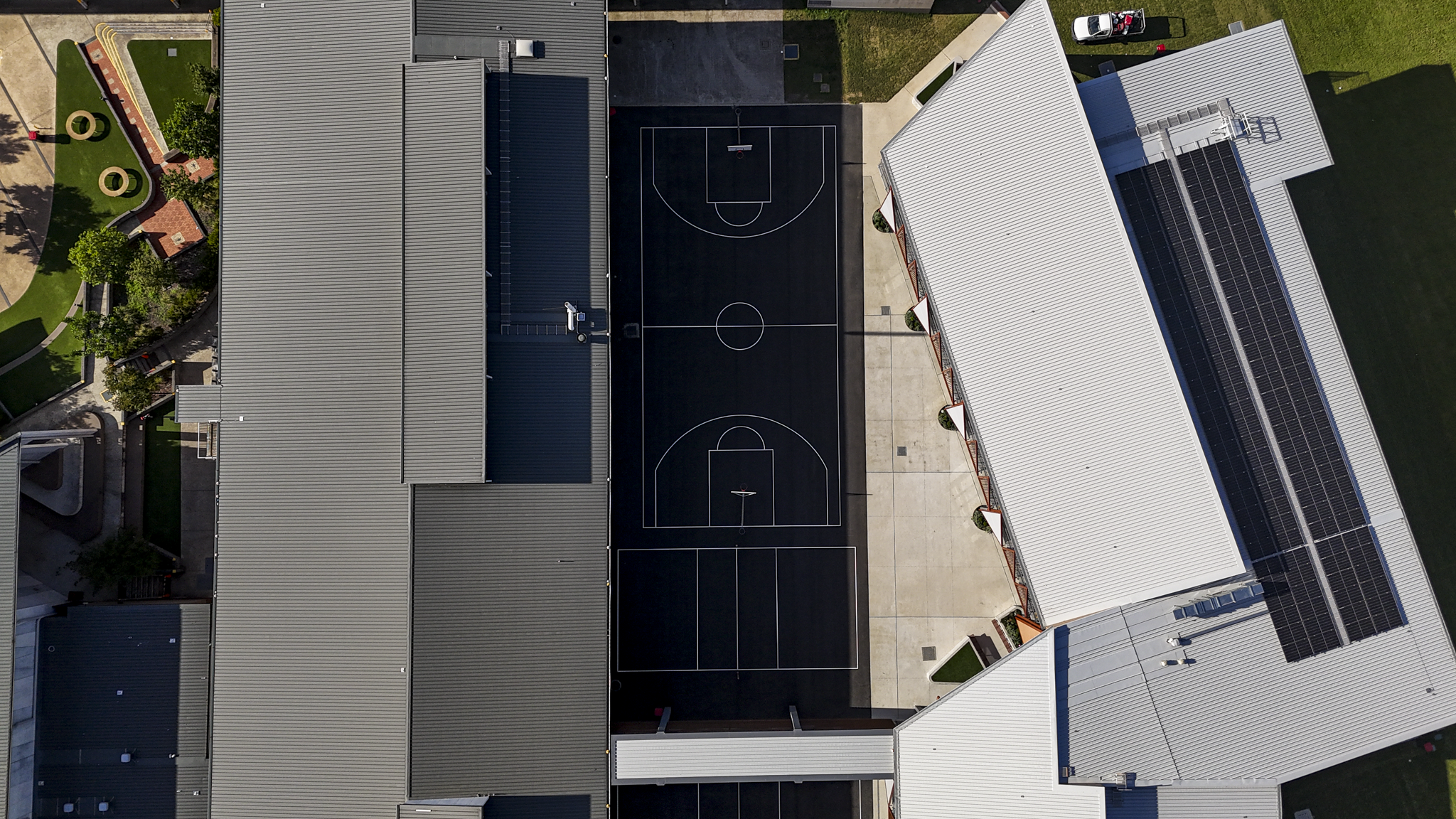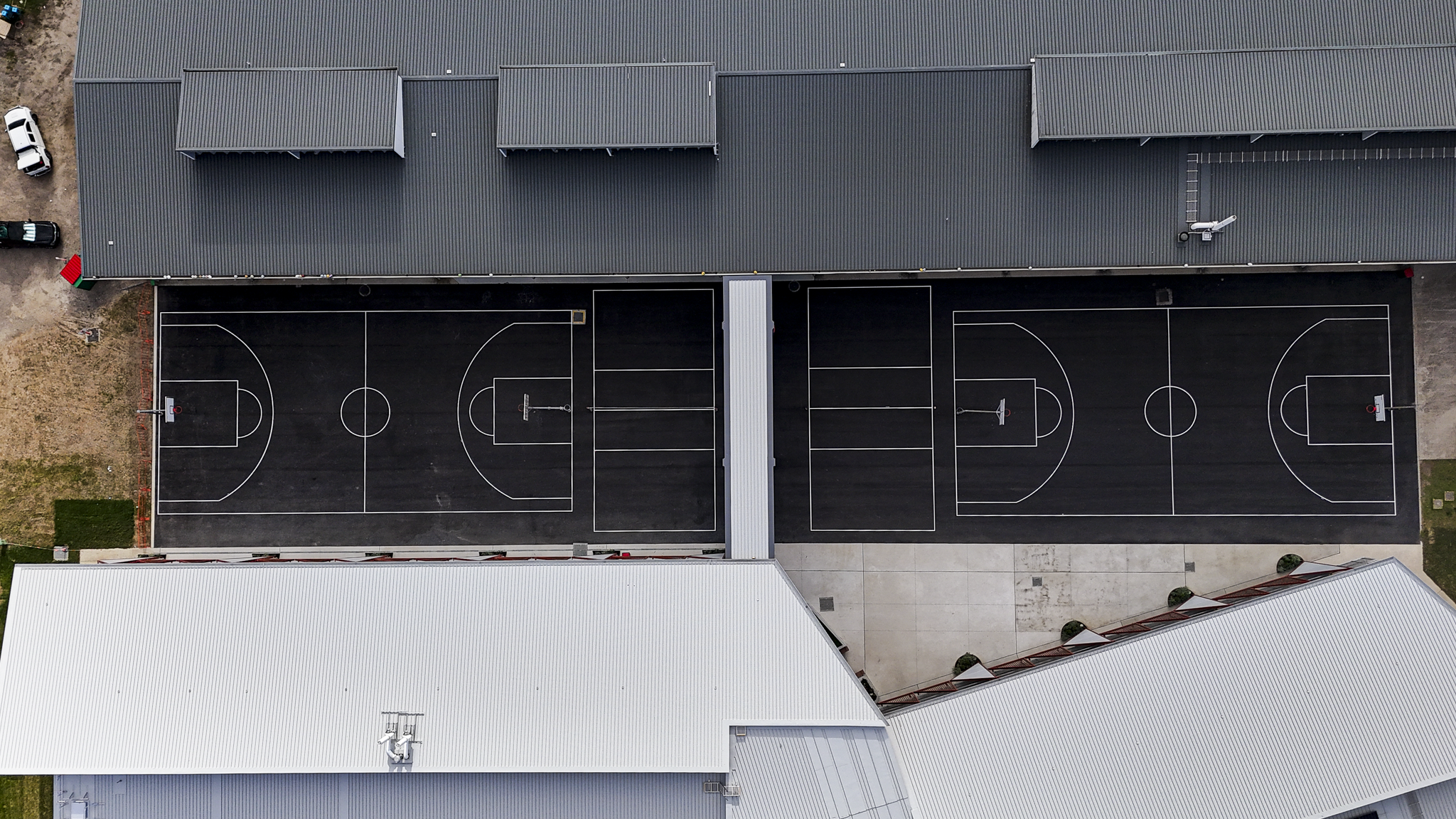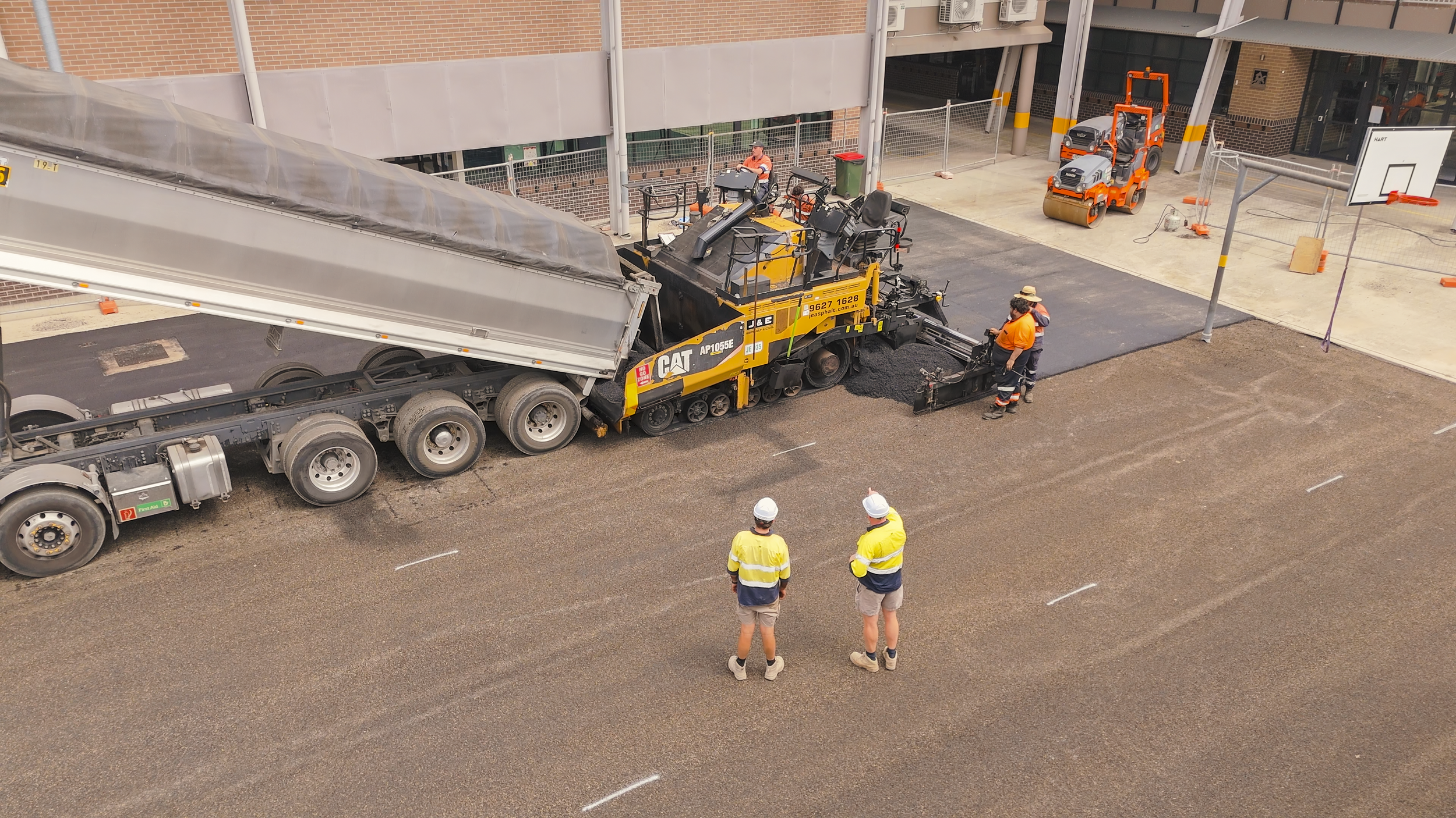 Covered for Prospect Landscapes across a multi-day project at St Johns XXII high school, capturing the complete transformation of a full-sized basketball court from bare ground to finished surface. The scope included aerial documentation of the asphalt lay, curing stages, and professional line marking — providing Prospect Landscapes with a comprehensive visual record of the build from start to finish.